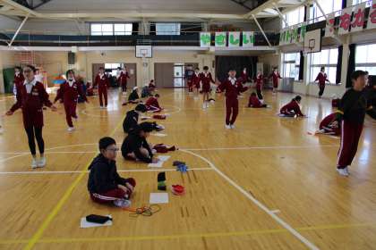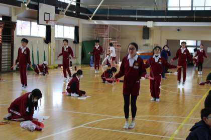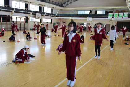 6年生は体育館で短なわとびに挑戦中です。自己記録更新目指してがんばれ!!