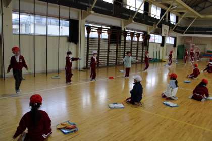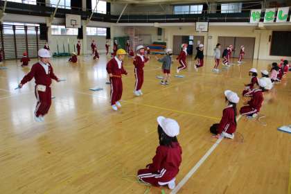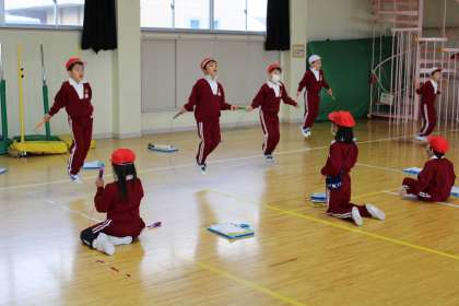 1年生は体育館で短なわとびに挑戦です。跳べる回数増えるように頑張っています。