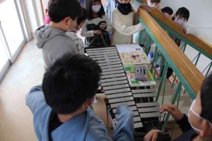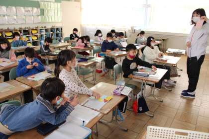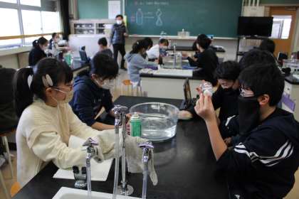 3年1組は音楽です。発表しているグループに合わせて手拍子を送っています。6年1組は理科です。水溶液の実験です。1年2組は算数です。図形の学習です。