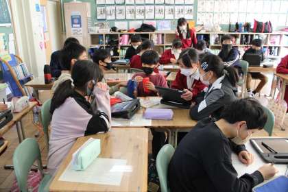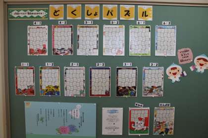図書室前廊下にはどくしょパズルが貼り出され、完成目指して挑戦中です。6年1組の廊下には1年1組から贈られたお礼の掲示物です。教室では、各自様々なことに取り組んでいる最中です。