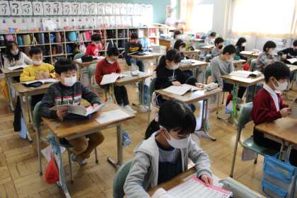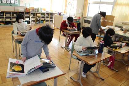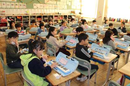 3年2組は音楽です。伴奏を聴きながら歌の感じを捉えています。2年1組は音楽です。鍵盤ハーモニカに挑戦です。たんぽぽ学級は、桜について、3つの視点から調べています。この後の続きが楽しいです。