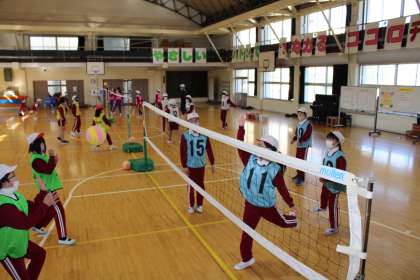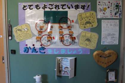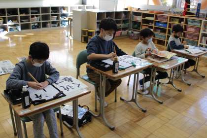 5年2組は体育です。ネット型ゲームで盛り上がっています。すみれ学級は習字と硬筆の学習です。手本をよく見て丁寧に書いています。保健室前廊下の掲示です。換気の大切さを訴えています。