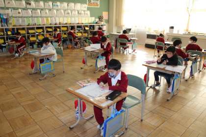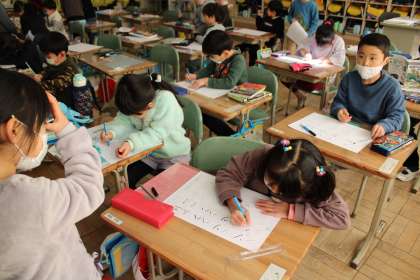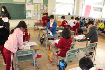 1年1組は、テストそしてプリントに挑戦中です。1年2組はテストの振り返りです。友達と確かめ合っています。