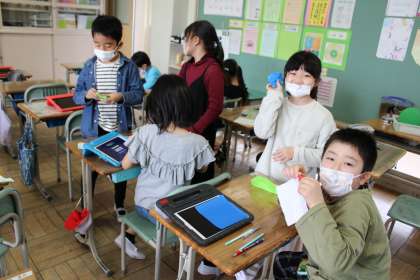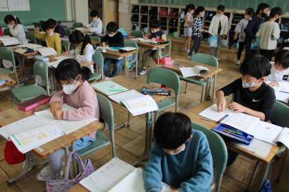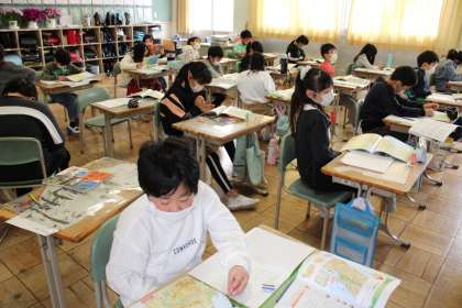 3年1組係活動でそれぞれに取り組んでいます。2年1組は算数です。次々と問題に挑戦しています。4年1組は社会です。地図帳片手に調べています。