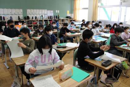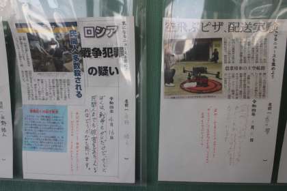 本日は午後の限られた時間の中での紹介になります。2回に向かう階段の掲示物の様子です。3年生の作品が飾られています。6年2組は一日の振り返りです。6年2組廊下の掲示です。気になる新聞記事という課題の提出物のようです。6年生は本日午前中は全国学力テストでした。