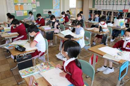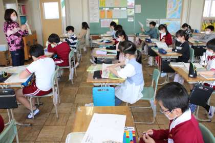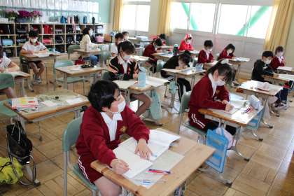 4年2組は社会の様子です。都道府県の位置や名前の学習です。4年1組は算数の様子です。