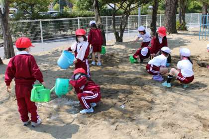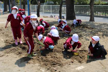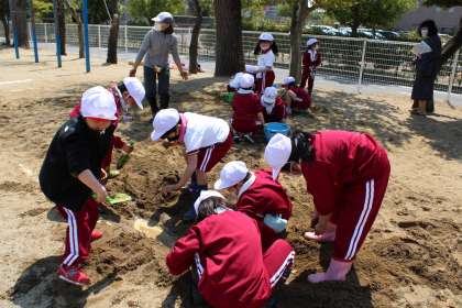 1年1組は生活科の様子です。砂場で友達とつながります。