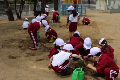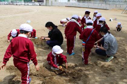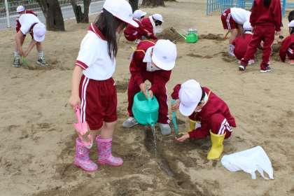 1年2組は砂場で思い思いに砂遊びです。友達とつながりあって仲良く活動に夢中です。