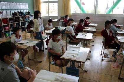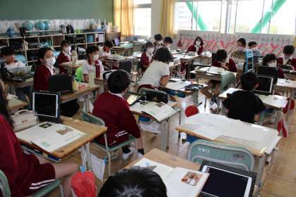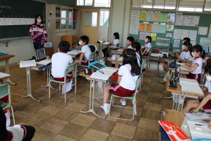 5年1組は道徳です。いろいろな意見が出て、みんなで話し合っています。4年2組と4年1組は算数です。話し合いが進んでくると、考えを話すときって思わず立ってしまいますよね。この前のめり感がいいですよね。