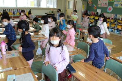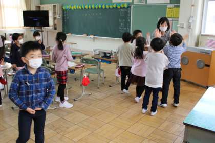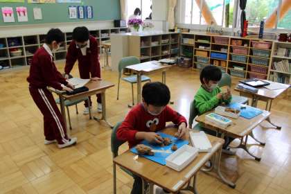 1年2組は音楽の様子です。リズムに合わせて動いて最後はハイタッチです。すみれ学級は粘土組と迷路作成組で取り組み中です。
