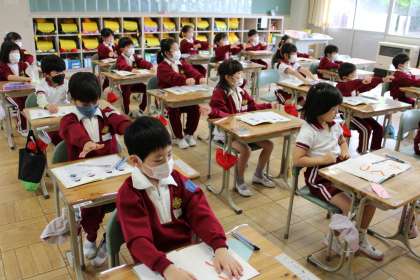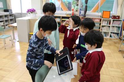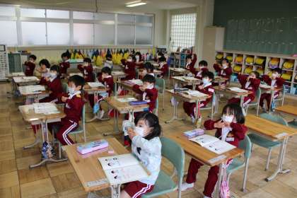すみれ学級は朝の活動中です。5人で順番を決めています。1年1組は国語です。まずは文字を書くための準備運動です。