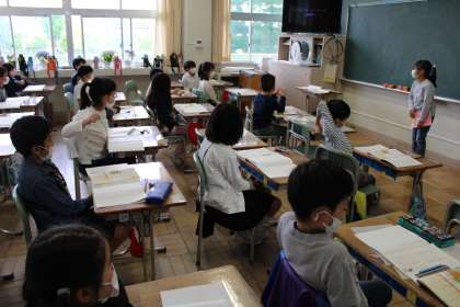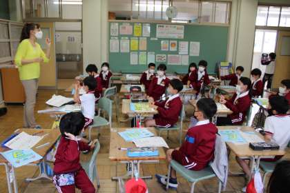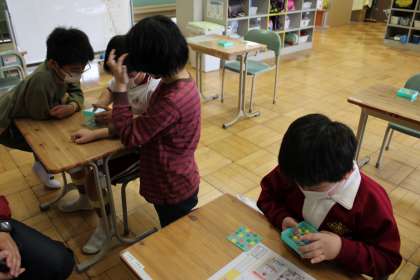 たんぽぽ学級は指定の場所に指定の色のボールを移す活動に取り組んでいます。2年2悔いはAETクロイ先生と英語表現科の学習です。これは何ですか?の学習です。3年1組は国語です。発表者に次々と質問をして発表内容を深めています。