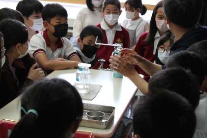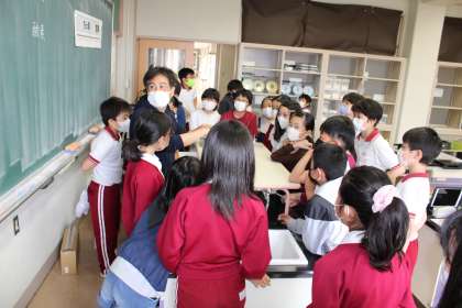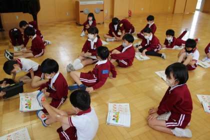 2年2組は音楽です。曲を聴いて感想を話しています。6年1組は理科です。物の燃え方について実験です。まずは大事なことを確認しています。