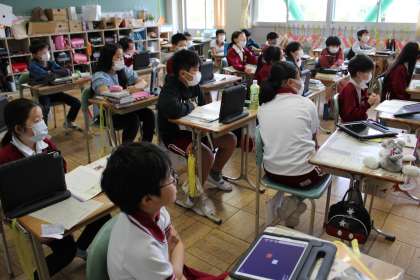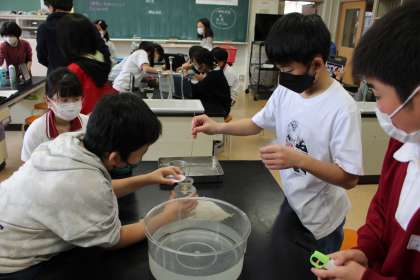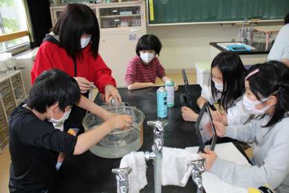 6年2組は理科です。ある気体は一瞬でろうそくの火が消えました。5年2組は道徳です。いろいろな考えを出し合って話し合っています。