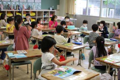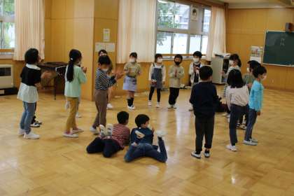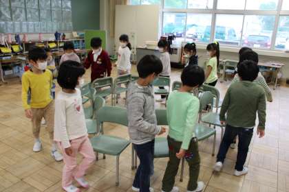 1年1組、1年2組、2年2組それぞれ音楽の様子です。リズムに合わせ体を動かしています。2年生は順番につながっていきます。姿勢や表現の仕方は様々です。