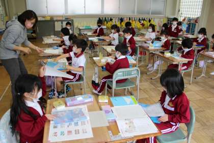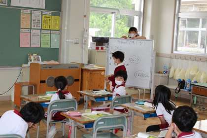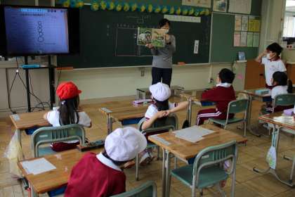 1年2組は担任の先生が読み聞かせをしています。1年2組は国語で友達の音読に合わせて演技しています。1年1組は算数です。合わせて10になる数の学習です。
