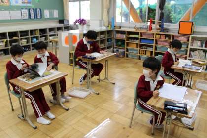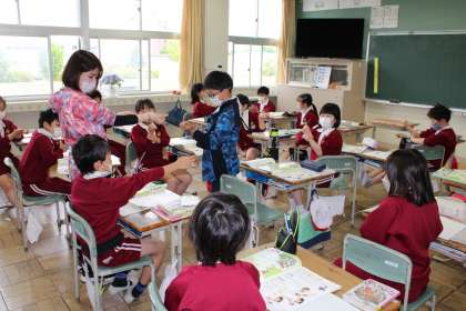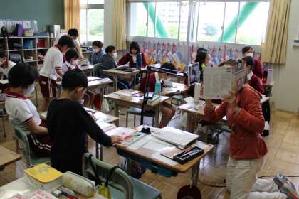 5年1組はAETクロイ先生と外国語科の学習です。4年2組は理科で人間の体の学習です。すみれ学級は、各自の課題に取り組んでいます。