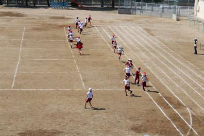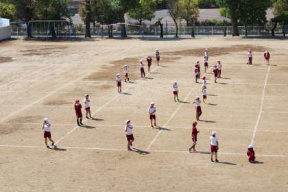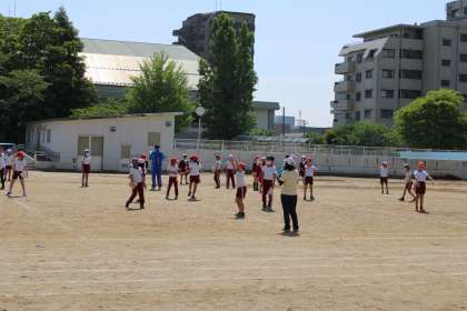 5年生は校庭で運動会の表現の練習です。移動の仕方、自分の場所等の確認です。