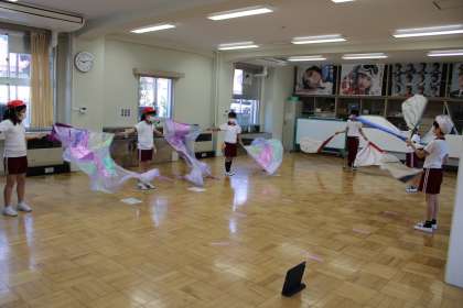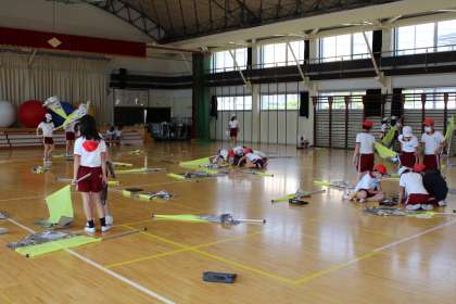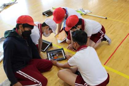 6年生は体育館とその周辺で、種具を使っての練習です。タブレットで昨年の動画を見て確認しながら進めています。
