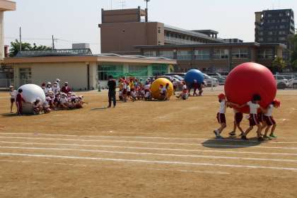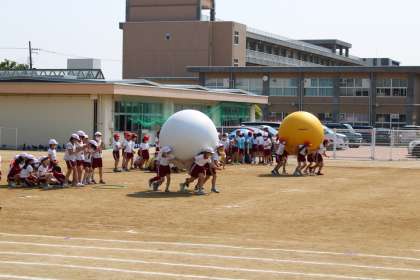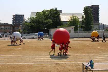 3・4年生は団体種目の練習です。大玉の扱いに苦労していますが、5人の力と心が一つになって、頑張っています。