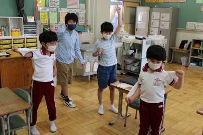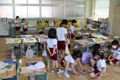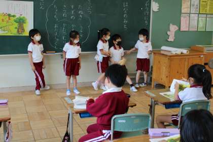 すみれ学級はタオルを使って運動です。1年2組は国語です。はなのみちの動作化です。1年1組も国語です。みんなで役割分担して演じています。はなのみちできています。