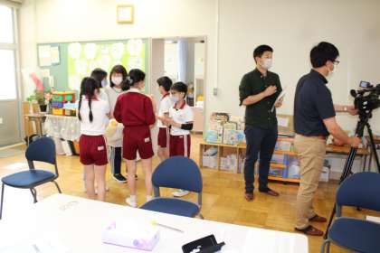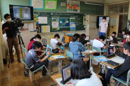 本日KFB福島放送の取材を受けました。5年1組小林学級でタブレットを活用した社会の授業の様子です。タブレットを使い子どもたちの様子やインタビュー、視力検査の風景を撮影しました。放送は6月になってから特集で行うそうです。予定では6月14日(火)18:15からの番組でということです。正式に案内がありましたら再度お知らせします。