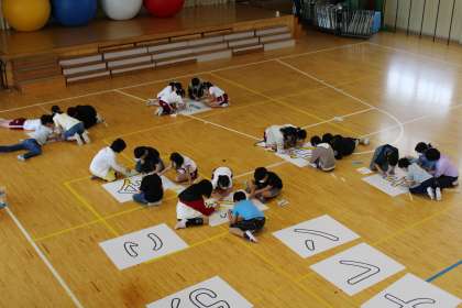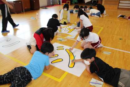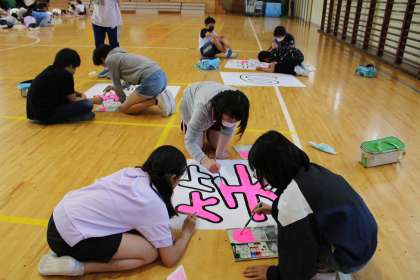 6年生は体育館で、運動会のテーマの色染めです。みんなで作業を進めています。