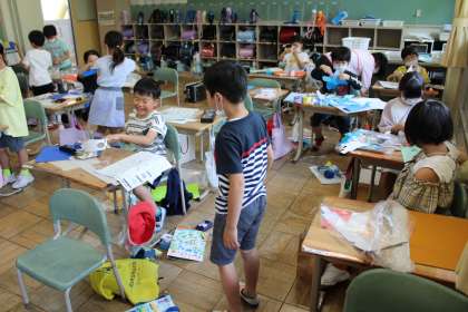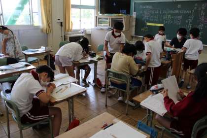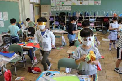 2年2組は図工です。変身中です。4年1組は算数です。学んだことさっそくドリルで確かめています。