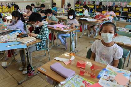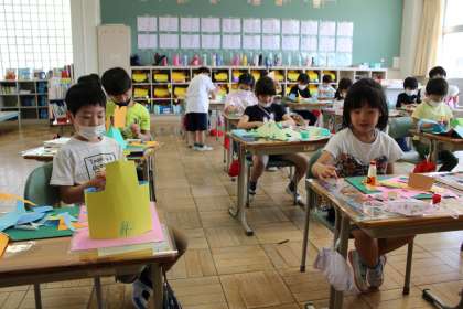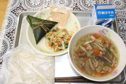 1年2組と1年1組は図工です。紙を切って、折って、立てるものを作っています。思い思いに取り組んでいます。本日の給食は、遅ればせながら端午の節句のお祝い献立で、ちまきが登場しました。