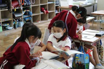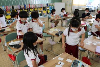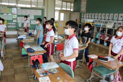 1年2組は算数です。カードを使って10のまとまりの学習です。2年2組も算数です。友達と一緒に考えています。4年2組は外国語活動の様子です。
