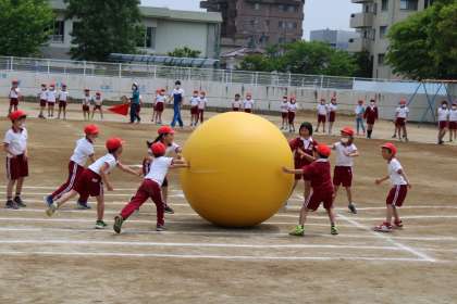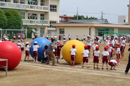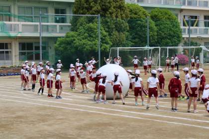 本日は運動会全校生種目の大玉ころがしの練習です。当日は、開成山陸上競技場400Mトラックを利用します。