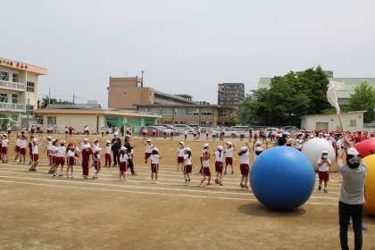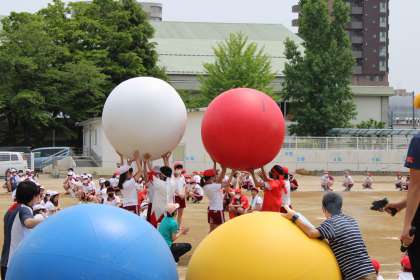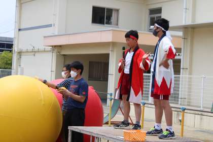 1回目は白組の勝ち、応援団長からチームのメンバーにアドバイス、紅組は大玉の押し方、白組は気合だそうです。