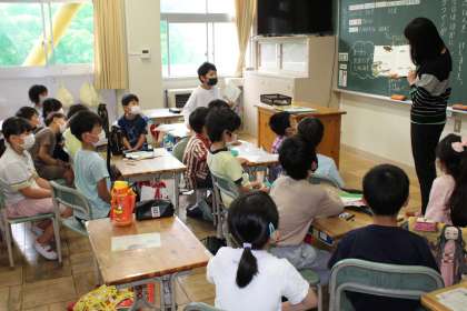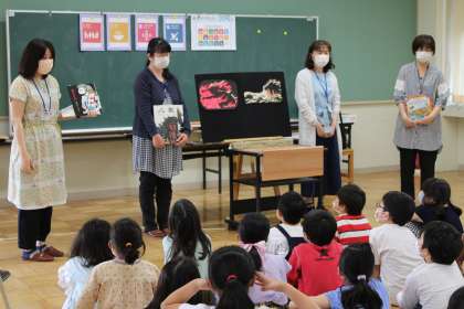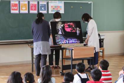 お話ランプの皆さんによる読み聞かせ、2年2組の様子です。3年生は図工室でブラックシアターでの読み聞かせです。想像性が広がります。心より感謝します。