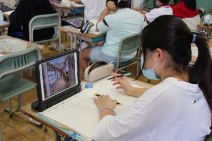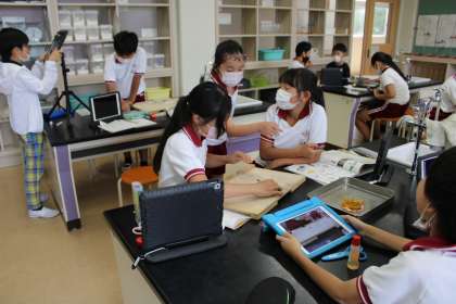 6年2組は図工です。校内を回って絵になりそうな場面をタブレットでパチリ、早速下書きです。5年2組は理科です。植物の種を使って実験です。