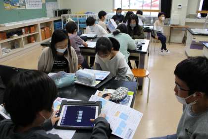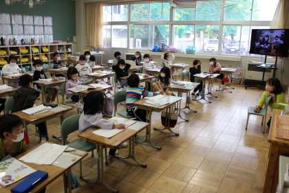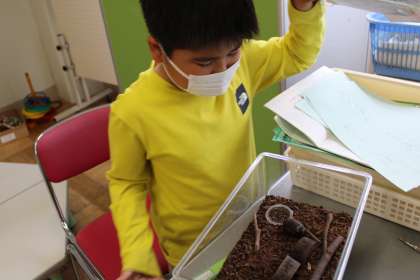 6年2組は理科で、テストの振り返りをしています。1年1組は生活科で、先日の学校探検のまとめです。1年2組、教室に早くもカブトムシ登場です。