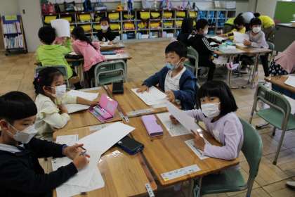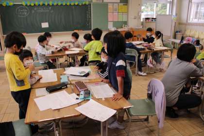 1年2組は生活科で先日の学校探検のまとめです。2年2組は図工です。卵を描いて割れて、これからどうなるでしょう?作品は後ほど掲載します。