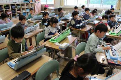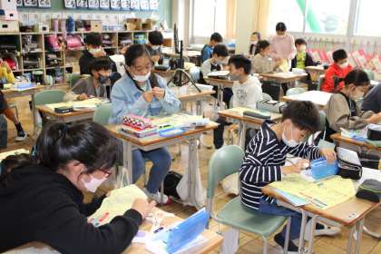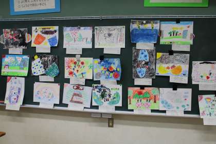 2年1組は音楽です。鍵盤ハーモニカに挑戦です。2年2組は図工の作品が黒板に貼ってありました。5年2組は家庭科です。裁縫の学習です。まずは玉結び、玉止めできるかな。