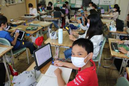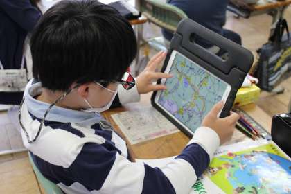 5年1組は理科です。タブレットで課題について調べています。4年2組は社会です。福島県について学習しています。