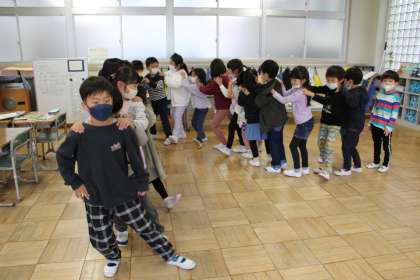 4年1組は道徳です。ノートに感想を書いています。1年1組は音楽です。楽しそうに音楽に合わせて動いています。