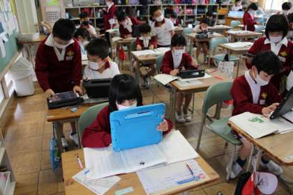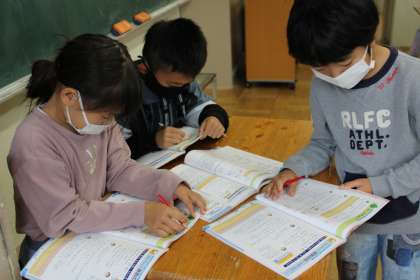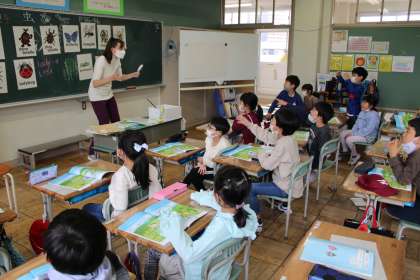 2年1組はクロイ先生と英語表現科の学習です。ムシの名前を学んでいます。2年2組は算数です。問題の答え合わせをしています。3年1組は国語です。昨日の授業研究の続きで、友達の考えをロイロノートで見て、話し合っています。