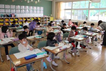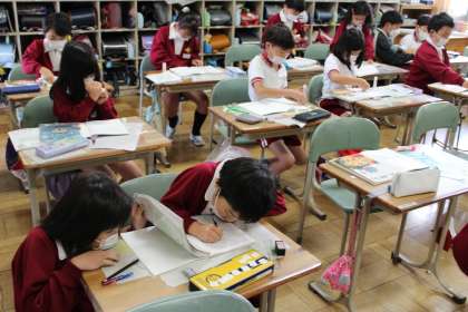 1年1組は算数です。3年1組廊下の掲示です。図工の作品が飾られています。3年2組は算数です。ノートに貼っています。
