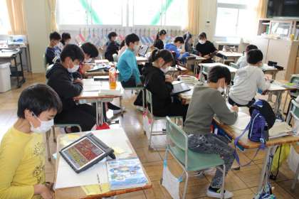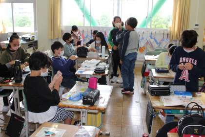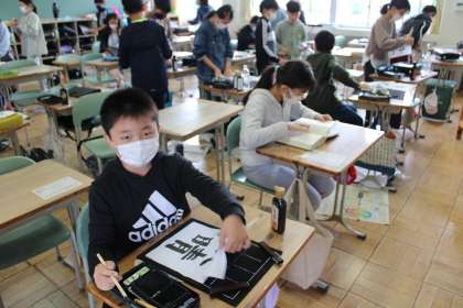 6年1組は習字です。5年2組は社会です。5年1組は家庭科で裁縫です。