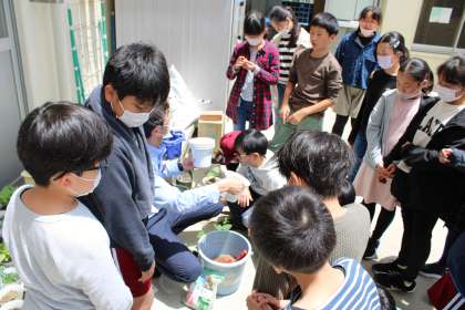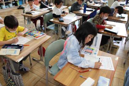 5年2組は理科です。植物観察中です。2年1組と2年2組は本日の町探検のまとめです。