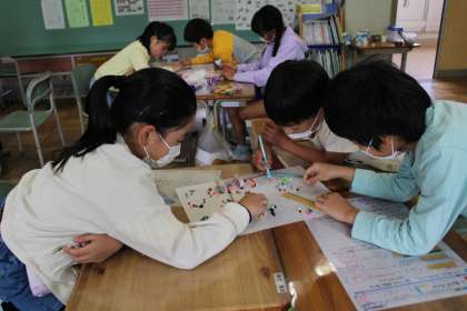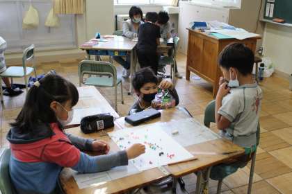 5年1組は理科です。本日の観察、今日の一枚見せてもらいました。2年2組は算数です。ビーズの数をグループで工夫して数えています。