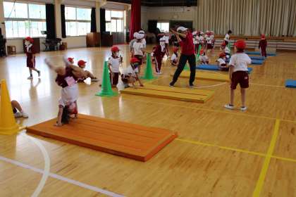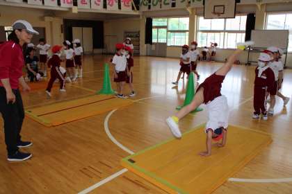 1年生は体育館でマット遊びです。今までの経験を活かし、自分ができるいろいろな回り方に挑戦です。楽しそうです。技をきれいにできる子もいてびっくりです。