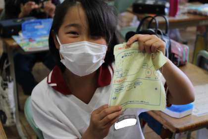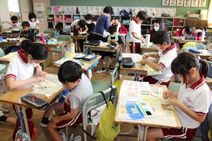 6年1組は図工です。色染め始まりました。5年1組は家庭科です。裁縫頑張っています。玉止め上手にできました。