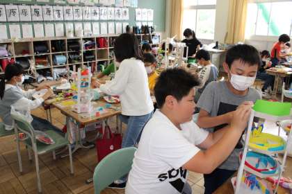 4年1組は図工です。立体になってきました。ビー玉の通り道大丈夫でしょうか?1年生は体育でマット遊びです。ゆりかごは基本となる動きです。