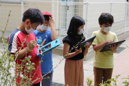 1年生マット遊びの続きです。鉛筆の気分で横にぐるぐる回っています。3年2組は外に出て6月を探しています。こんな感じに写真撮りました。