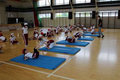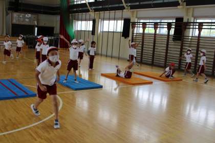6年生修学旅行でお世話になる場所に自分で予約です。職員室の電話で行っています。2年生はマット遊びです。前転ポーズもつけて上手になってきました。