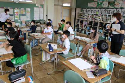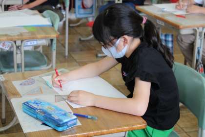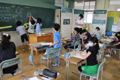4年1組は算数です。描いた図形から感じたことを話し合っています。